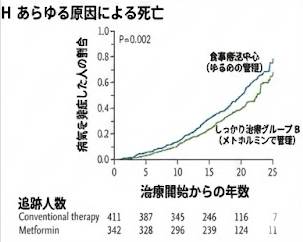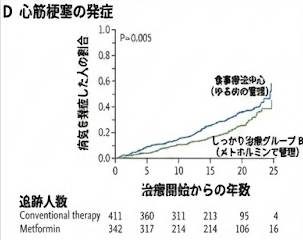 - かつて徹底的に治療していたグループは、その後血糖値が上がってしまったとしても、心筋梗塞の発症率が低く、死亡リスクも低かったのです。