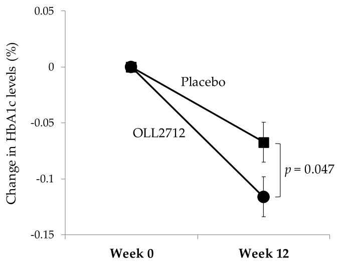 方法:MI-2乳酸菌を含むヨーグルトを食べた群と含まない通常ヨーグルトを食べた群のHbA1cを12週間後に比べた